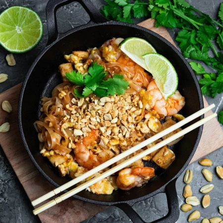 Тайский сливочный суп с креветкой, шампиньонами, красным лучком, с добавлением кокосового молока, кинзы и лайма. Подается с рисом