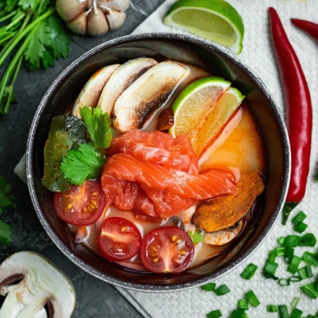 Традиционный тайский супчик с лососем, помидорками черри, шампиньонами, красным лучком, с добавлением кокосового молока, кинзы и лайма. Подаётся с рисом.