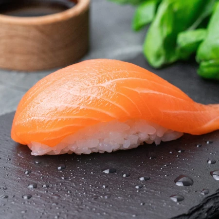 Наш фирменный ролл с крабом «Сурими», авокадо, икрой летучей рыбы, с шапочкой из острого лосося