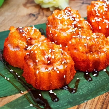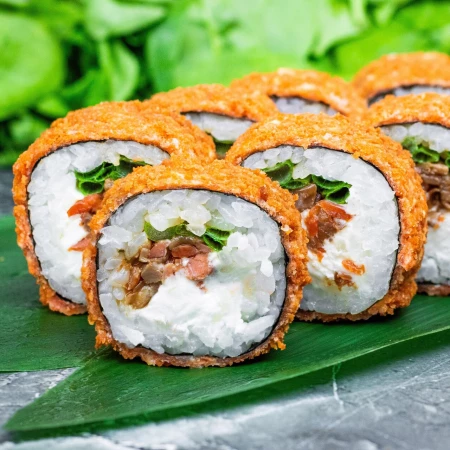 запеченный ролл с креветкой, творожным сыром и овощами под острой шапочкой Том Ям