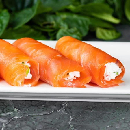 Рулетики из лосося, с крабом, творожным сыром и зеленым лучком. Подается с соусом Тар-Тар