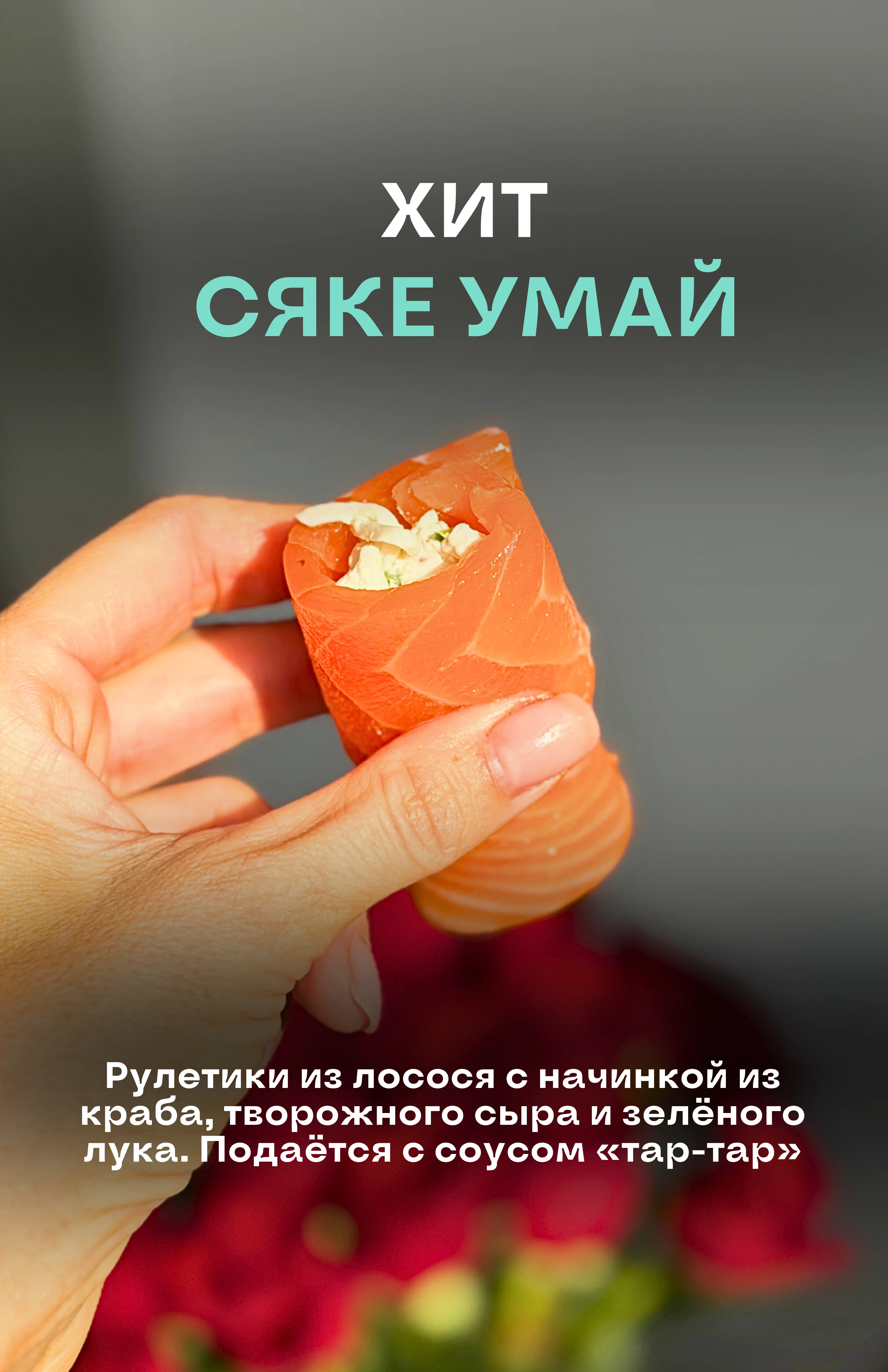 Рулетики из лосося, с крабом, творожным сыром и зеленым лучком. Подается с соусом Тар-Тар