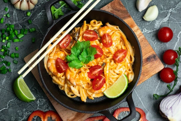 Состав: Удон, креветка, шампиньоны, лук красный, паста том ям, сливки, кокосовое молоко, лист лайма, соус шрирача. Украшение: помидорки черри, долька лайма, кинза.